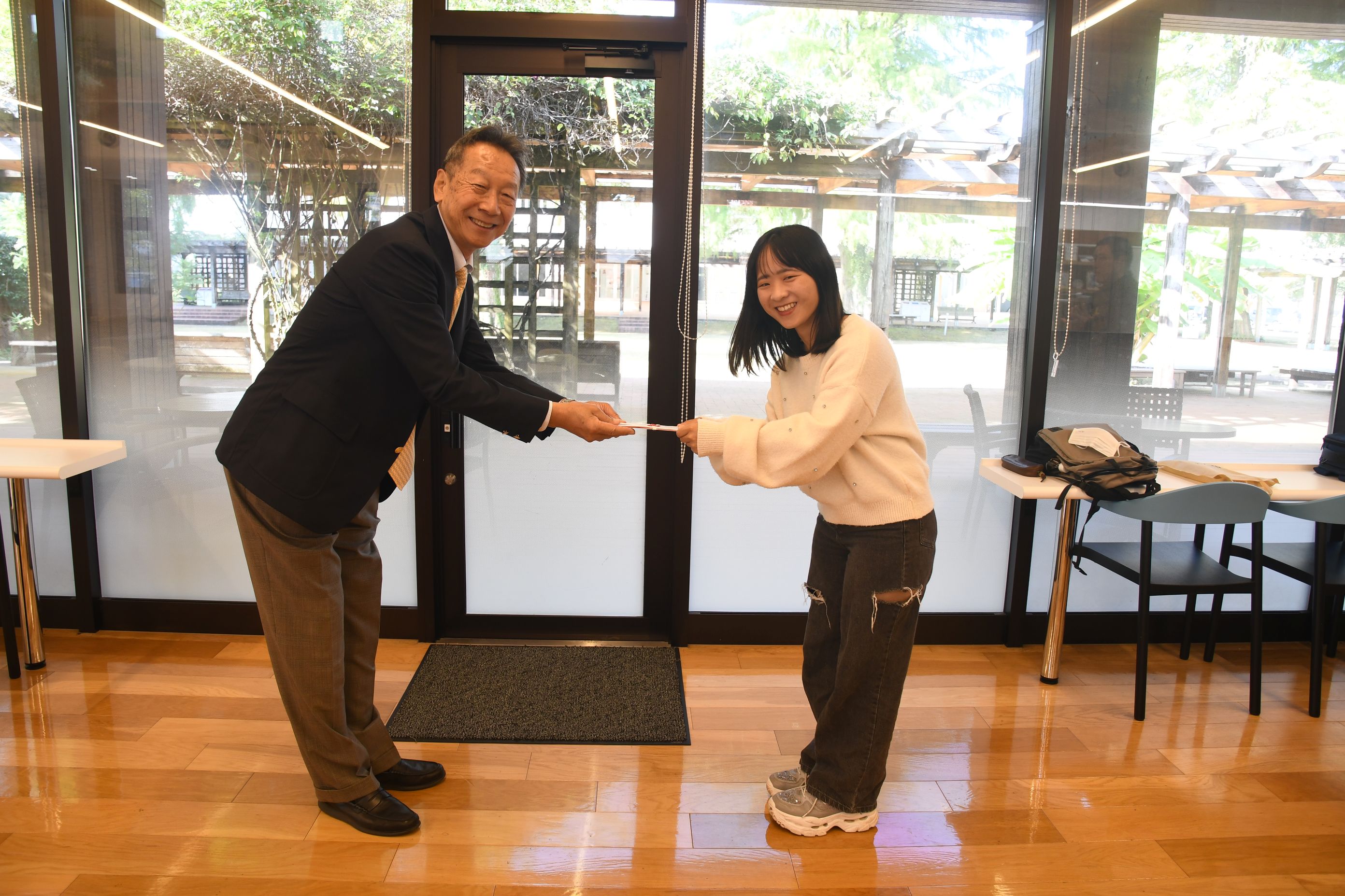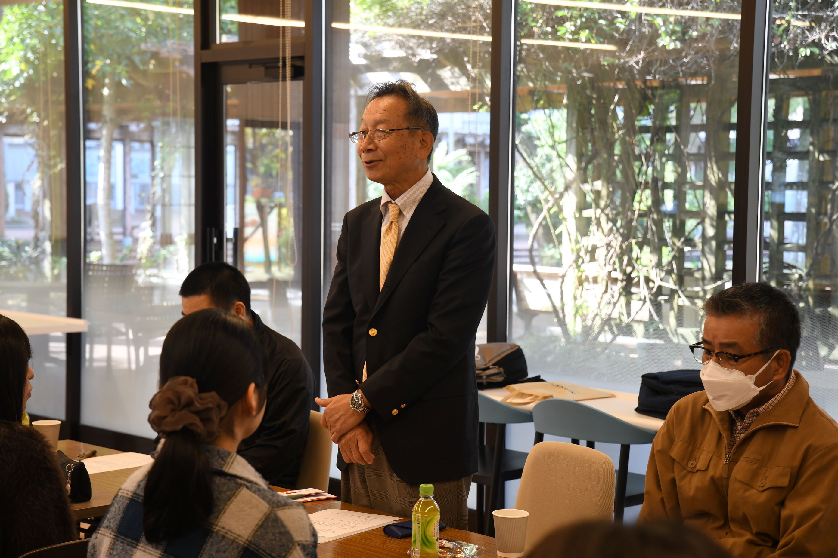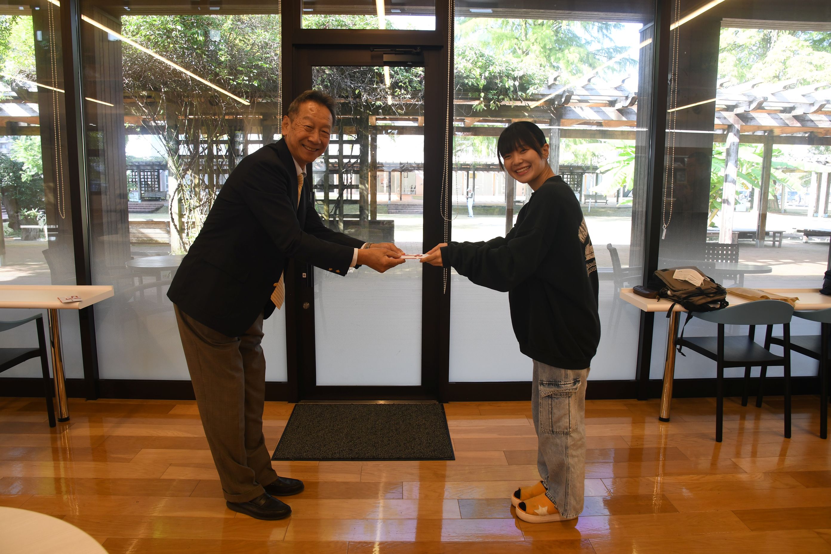 交流会では、大学祭支援金の贈呈がありました。その後、学生さんと学生生活等について意見交換会やOBの岩熊直樹氏による特別講演も開催されました。